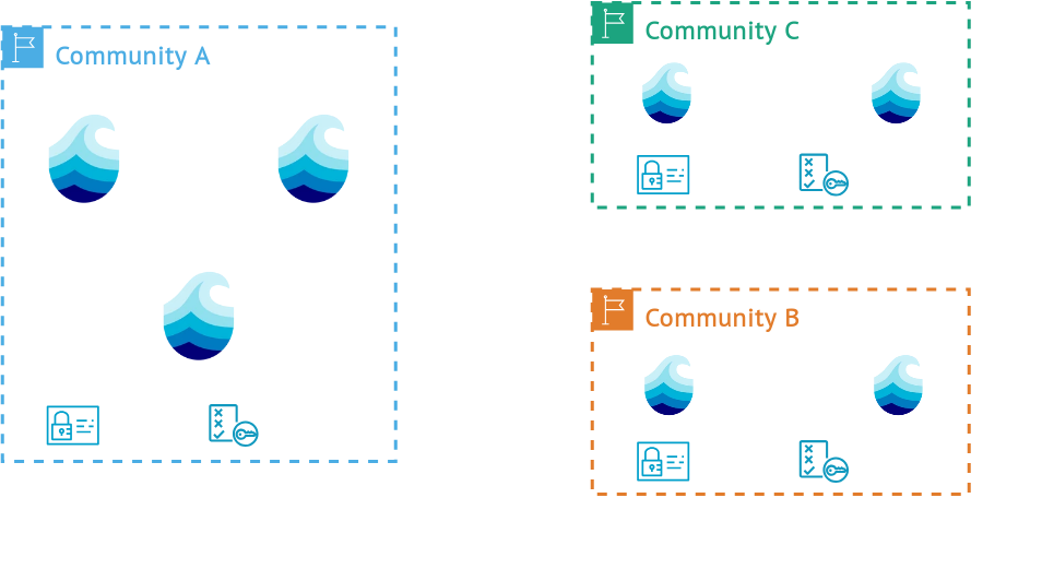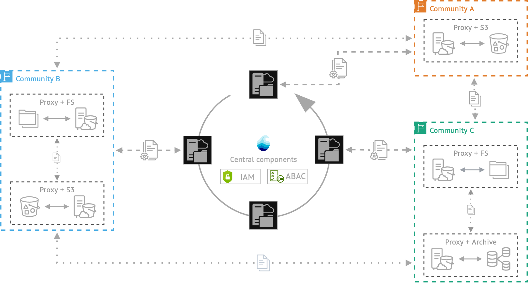 Because realms share the same cryptographic key, nodes participating in realms trust each other. This ensures that a set of defined Nodes uses the same policies for authorization, authentication, metadata handling and data replication. By default access relevant information is shared with every other node in a realm. Data and metadata can be replicated by default to nodes inside a realm, while manual replication is still possibly with other nodes from other realms, but without the guarantee to use the same access restrictions. This flexible approach guarantees a resilient data storage system, where data and metadata can be dynamically transferred. Policies can for example, define how access should be managed, how data should be replicated, which metadata standards need to be enforced or which fields need to be set on metadata, so that consistent metadata handling is ensured in a realm. Users that are registered in a realm can interact with other realms via the identity provider used by their home-realm, supporting interoperability between nodes and realms.